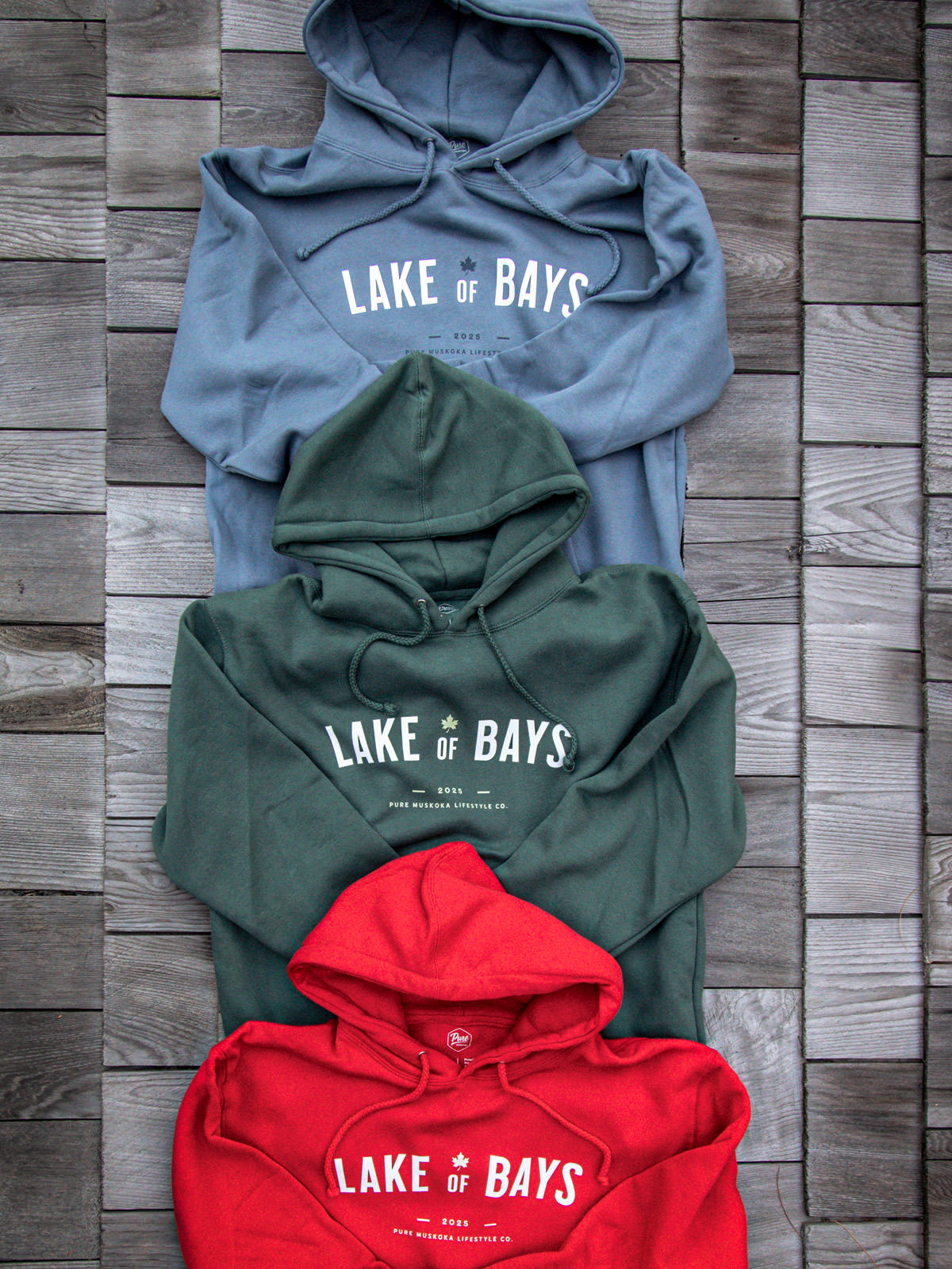Celebrate the essence of Lake of Bays. A piece of Muskoka pride, this hoodie is made to order, designed with our signature style, and available in six stunning colours that reflect the beauty and spirit of this special place.