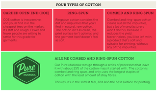 The grade of cotton used in manufacturing determines its quality - specifically how the cotton is refined before it’s spun for garments.