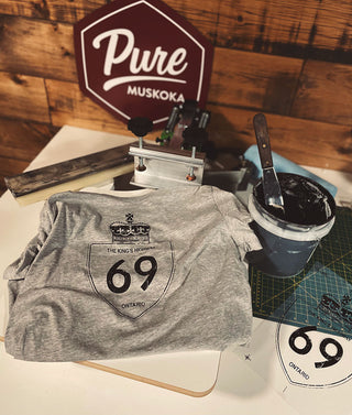 Pure Muskoka owns its own printing presses and we do all of the screen printing ourselves right here in Muskoka.