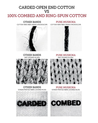 Pure Muskoka tees have a retail fit, so they fall and wear more naturally around your body, flowing with the curve of your chest, torso, and hips. The ribbed knit stitching on the collar looks stylish and also keeps the shirt looking fresh for years. We only sell side-seamed t-shirts (never tublar).