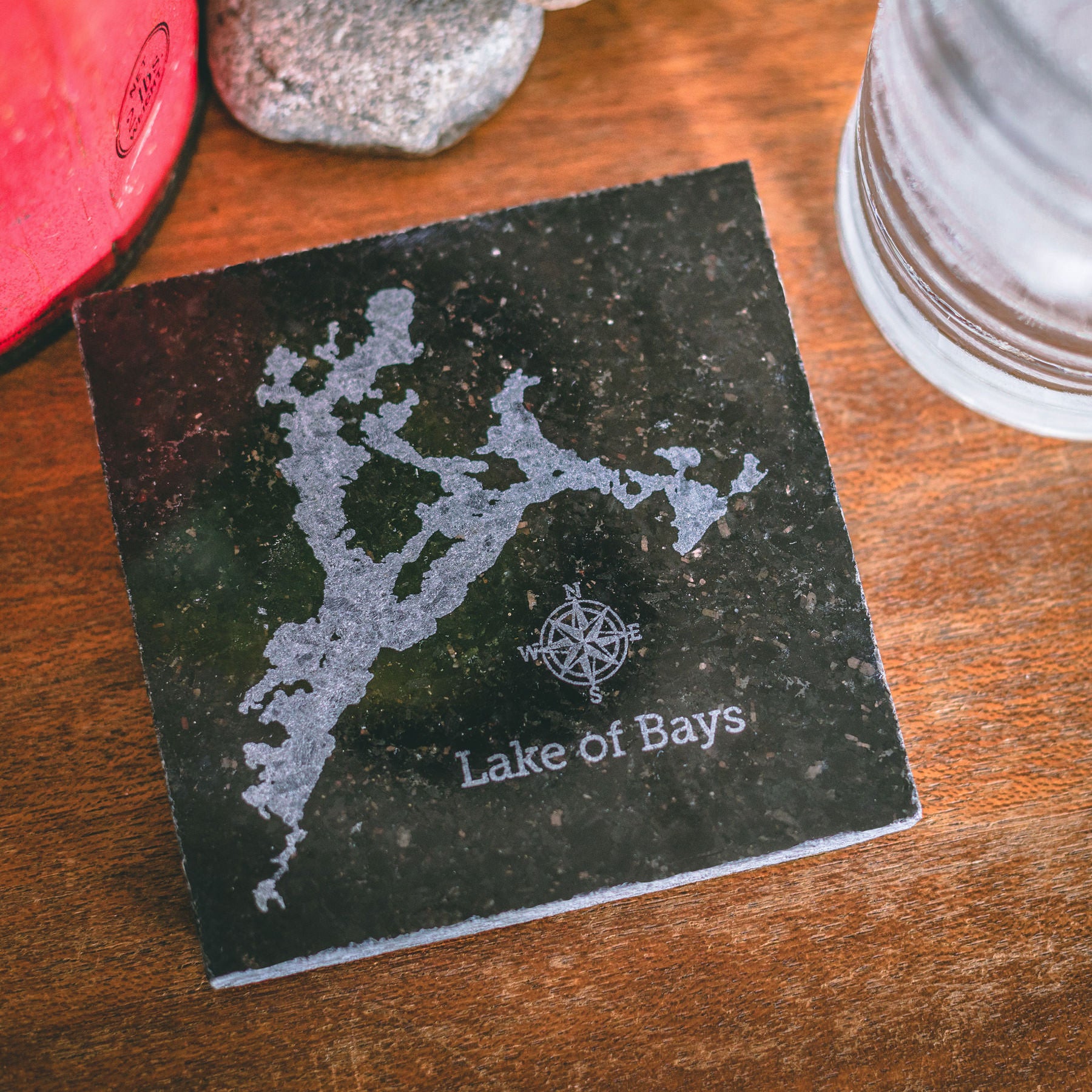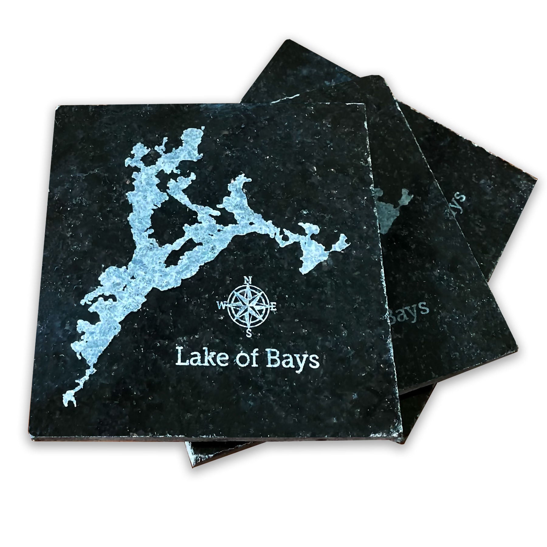 Bring that "Muskoka Feeling" to your table with these raw natural granite coasters. Lake of Bays is laser etched and painted into the natural, polished granite.