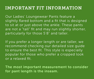 FIT ALERT - THIS STYLE RUNS SMALL. Our ladies' loungewear pants feature a very slightly flared bottom and a fit that is designed to sit at or just above the ankle. These pants are not a "tall" fit and may run slightly shorter, particularly for those 5'8" and taller. If you prefer a longer length or are taller, we recommend checking our detailed size guide to ensure the best fit. This style is especially popular for those who prefer a cropped look or a relaxed fit. The most important measurement to consider for pant length is the inseam.